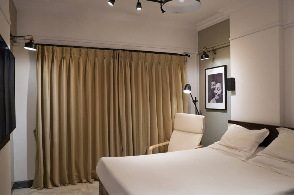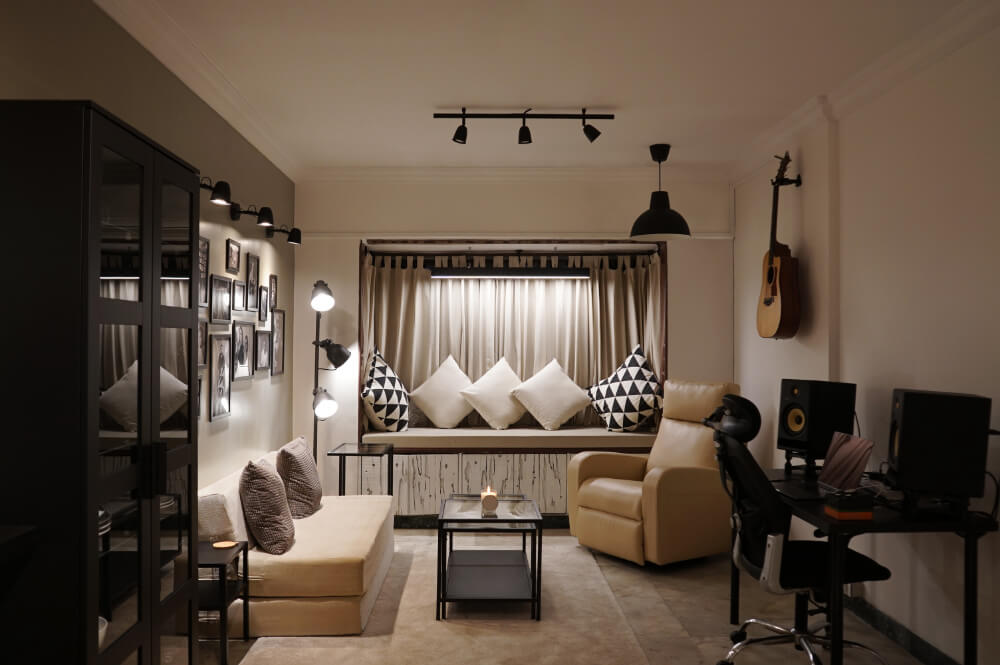 Designed for a playback singer in Mumbai, India, this apartment is a blend of soft hues, textures and contrasts giving it a sleek modern look. It is known for its minimalist color palettes and cozy to achieve a sleek and sophisticated, modern design approach. The audio workstation in the living room fulfills client’s personal requirements, which was to have a home studio vibe inside the apartment.