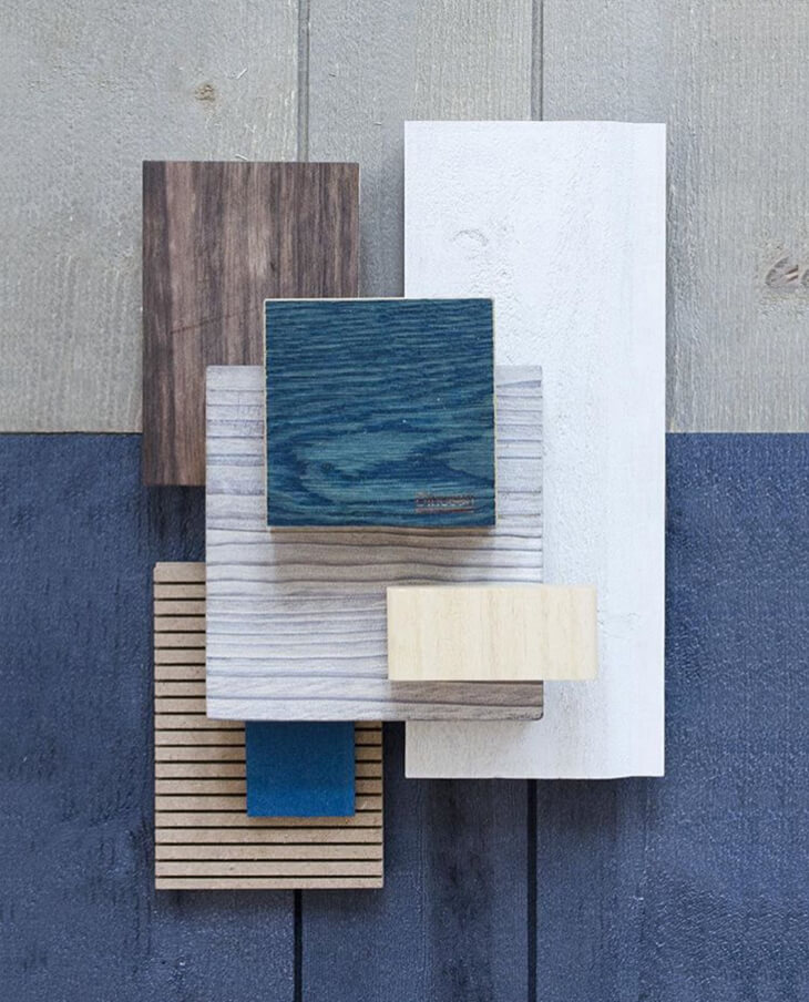 Blue is a perfect material to be combined with raw material and natural wooden elements because it provides contrast and warmth in the space.