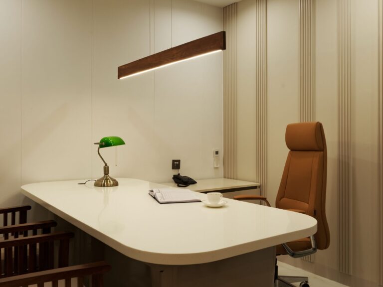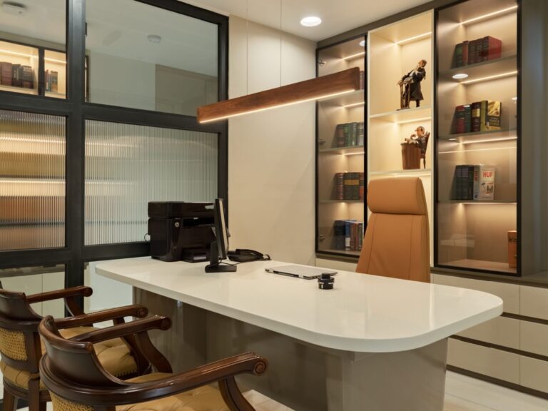 With the skillful incorporation of chic and fashionable touches, she curated a space that radiates a refined, cutting-edge aesthetic while upholding the seriousness and elegance befitting a prestigious law firm.